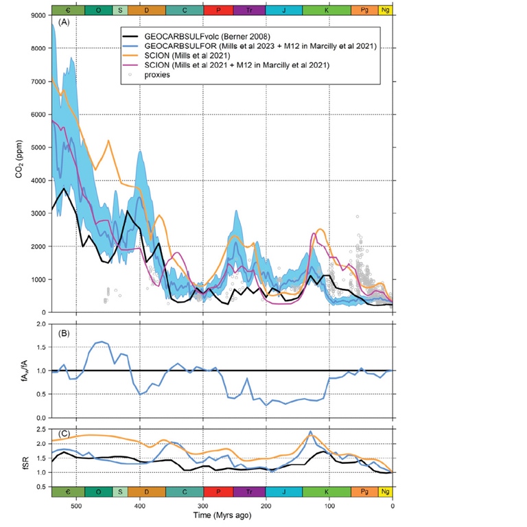 Carbon cycle models – such as the GEOCARB, COPSE, and SCION frameworks – remain central to quantifying long-term CO2 evolution. These models simulate the transfer of carbon among Earth's reservoirs and provide critical context for interpreting proxy records. Recent developments focus on reducing model uncertainty by refining representations of climate sensitivity, silicate weath-ering, vegetation dynamics, and lithological heterogeneity. Notably, spatially explicit modelling efforts have improved reconstructions for the Cretaceous–Cenozoic interval, aligning model outputs more closely with proxy data.