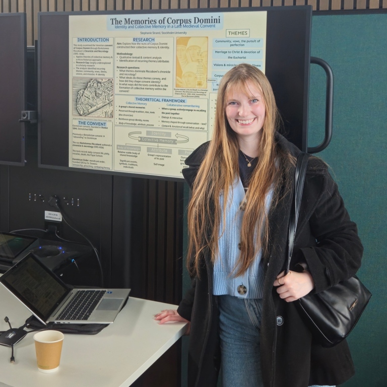 Mikael Bergstrand och Stephanie Strand är båda två inne på andra och sista året på Masterprogrammet i medeltidsstudier, och således närmar sig möjligheten för de båda att kunna ta steget ut i yrkeslivet som forskare. Likt många studenter som närmar sig slutet av sin studietid vill Stephanie och Mikael gärna bygga upp sina akademiska meriter, även utanför ramarna av avklarade tentamina och uppsatser. Ett sätt som masterstudenter kan göra det på är att delta och presentera sin forskning på akademiska konferenser, vilket både Mikael och Stephanie gjort nu under höstterminen.