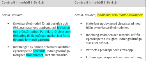 För att få en överblick över de förändringar som har gjorts vid revideringen av kursplanen i kemi, har vi på KRC gjort en jämförelse av varje del i kursplanerna.