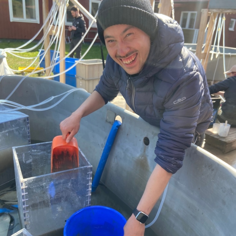 Moritz Nusser is removing sediment from the mesocosm to sieve out burrowing animals. After sieving, the sediment was re-added to the mesocosm, ensuring that only the animals intentionally added for the treatments remained during the experiment. Photo: Sara Westerström
